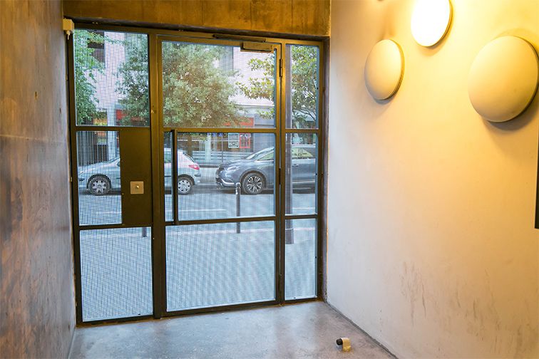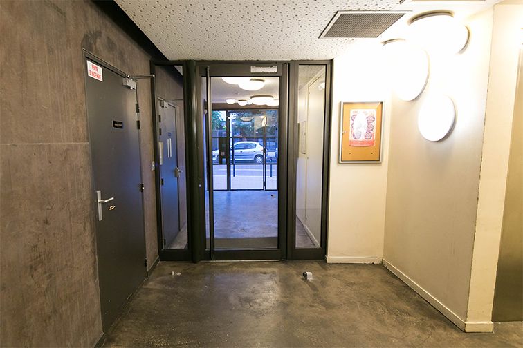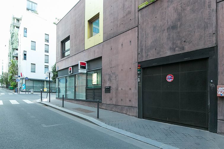 L'entrée du parking se trouve au 12 rue Hélène Brion, juste à droite de l'enseigne Société Générale. La porte piéton est située à droite de la porte voiture.